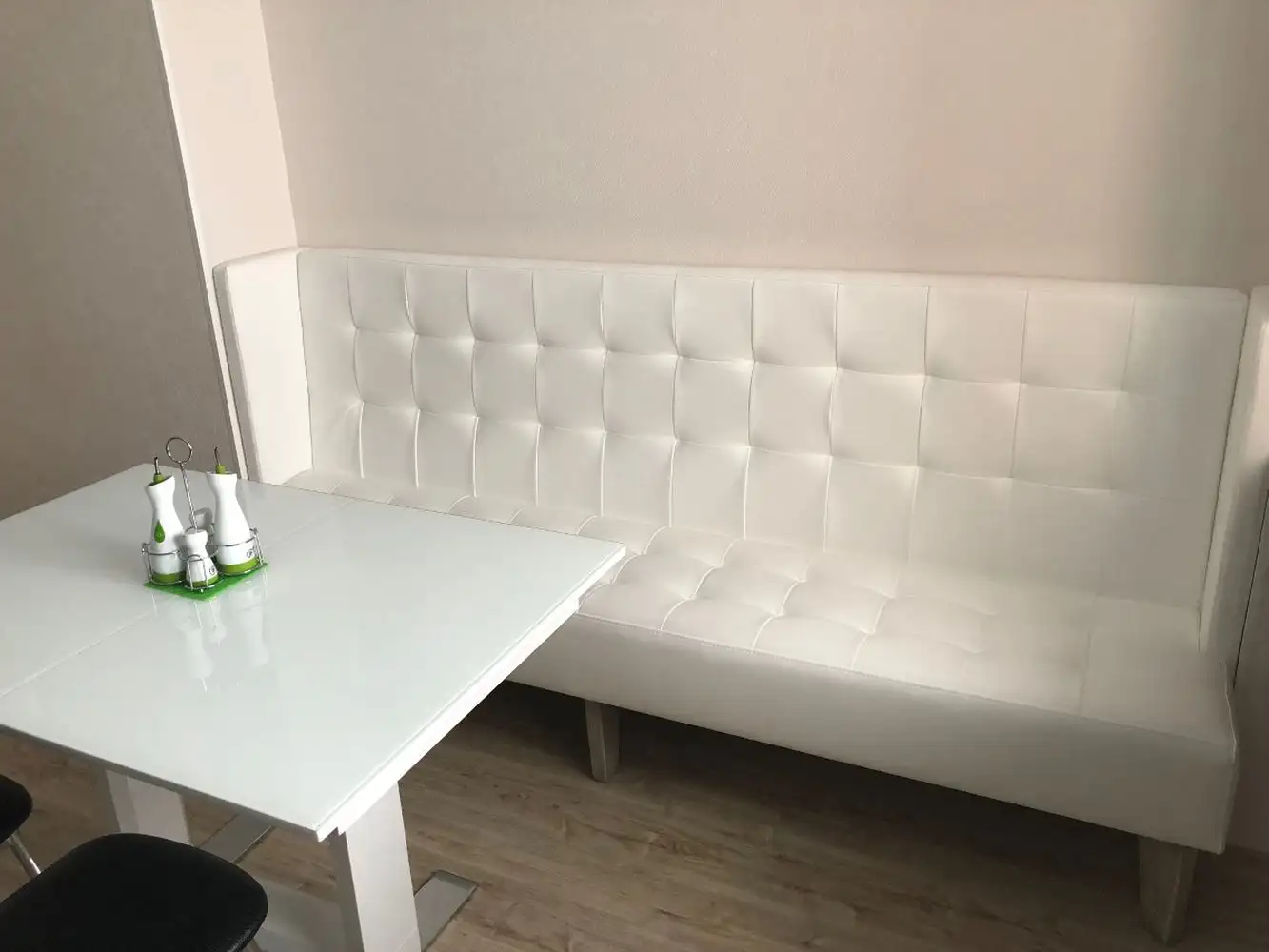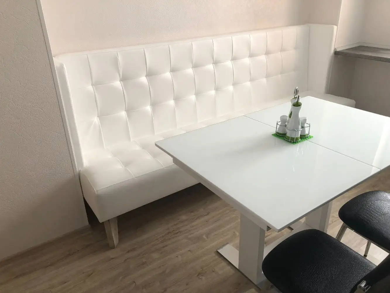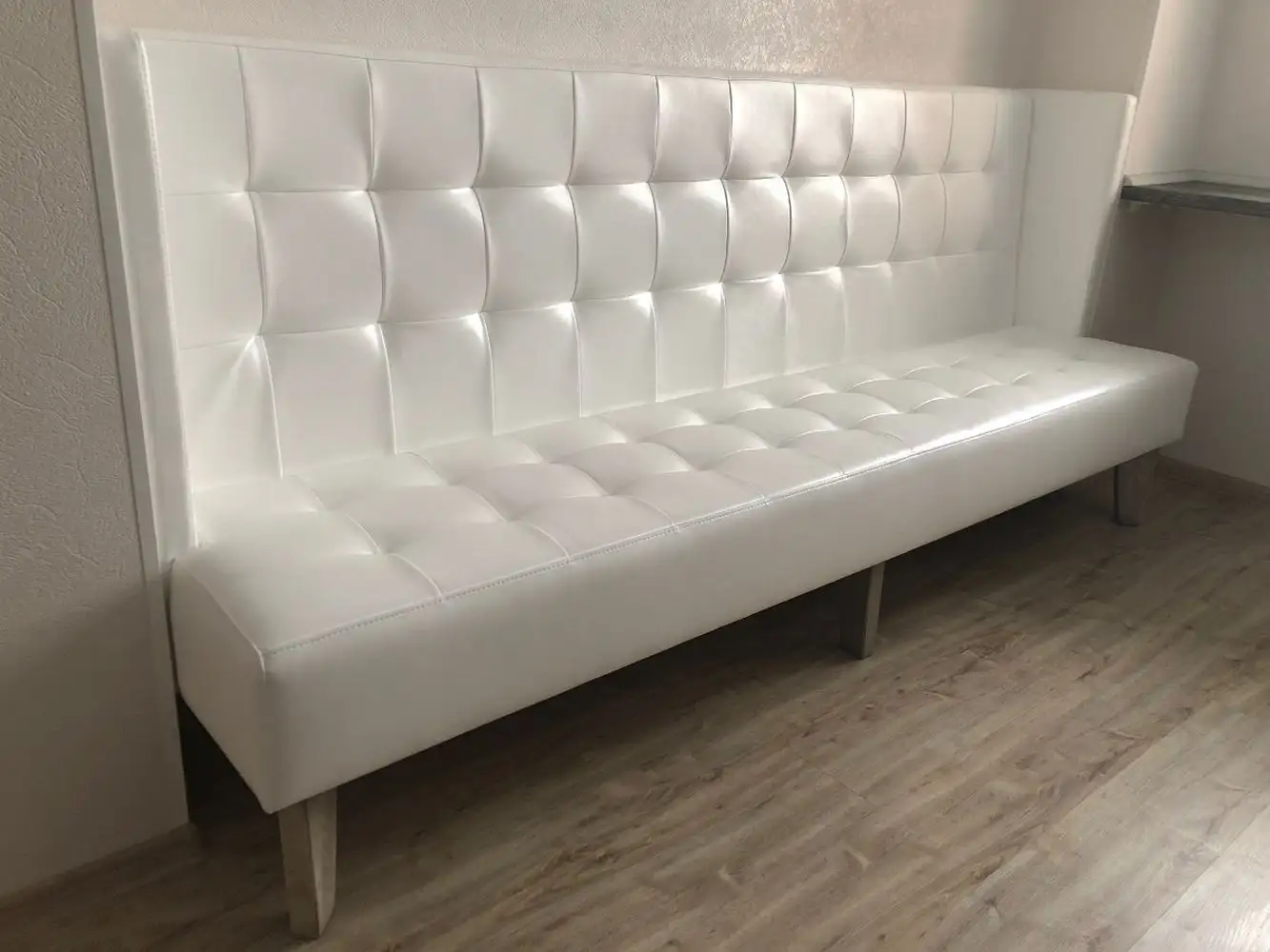 Диван на кухню — это отличная замена обычным стульям. Он увеличивает число сидящих мест. Немного была изменена форма дивана Олфорд — были добавлены подлокотники, вместо каретной стяжки сделали квадратную, деревянные опоры подобрали под цвет пола. Диван был сделан по индивидуальным размерам.