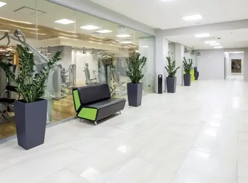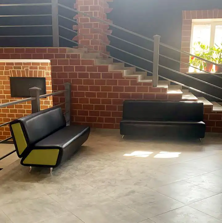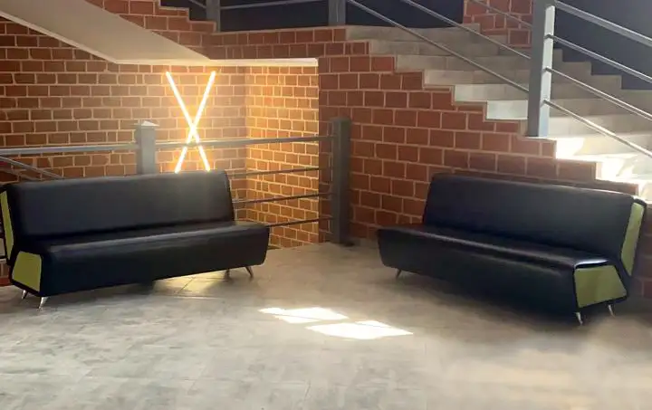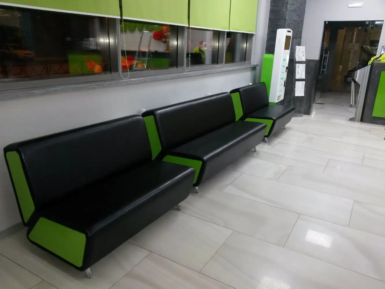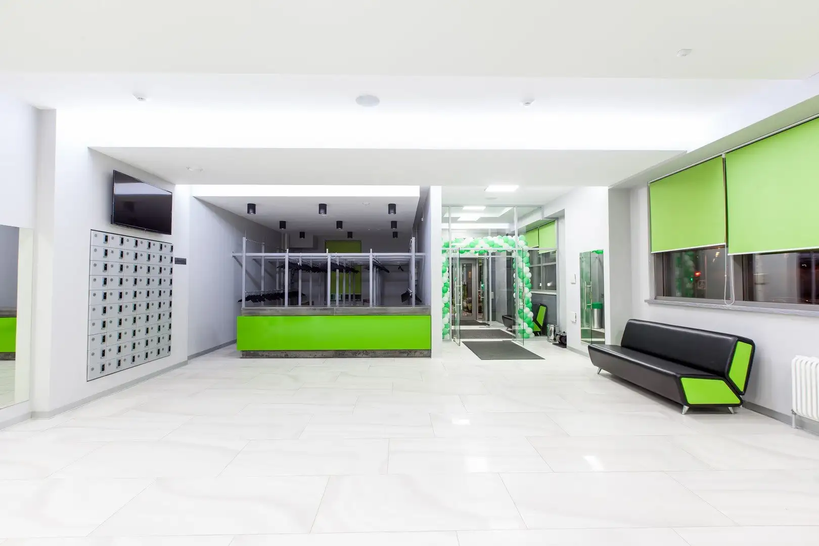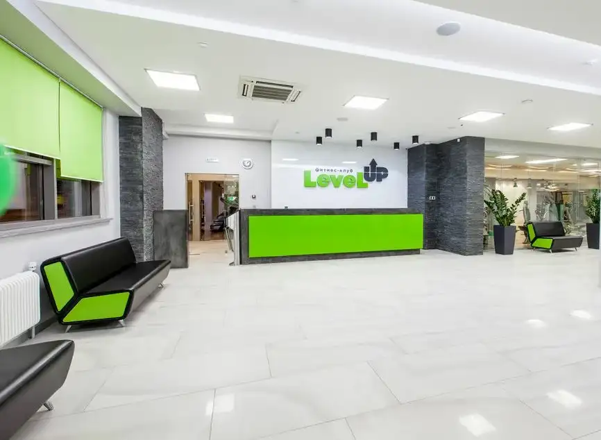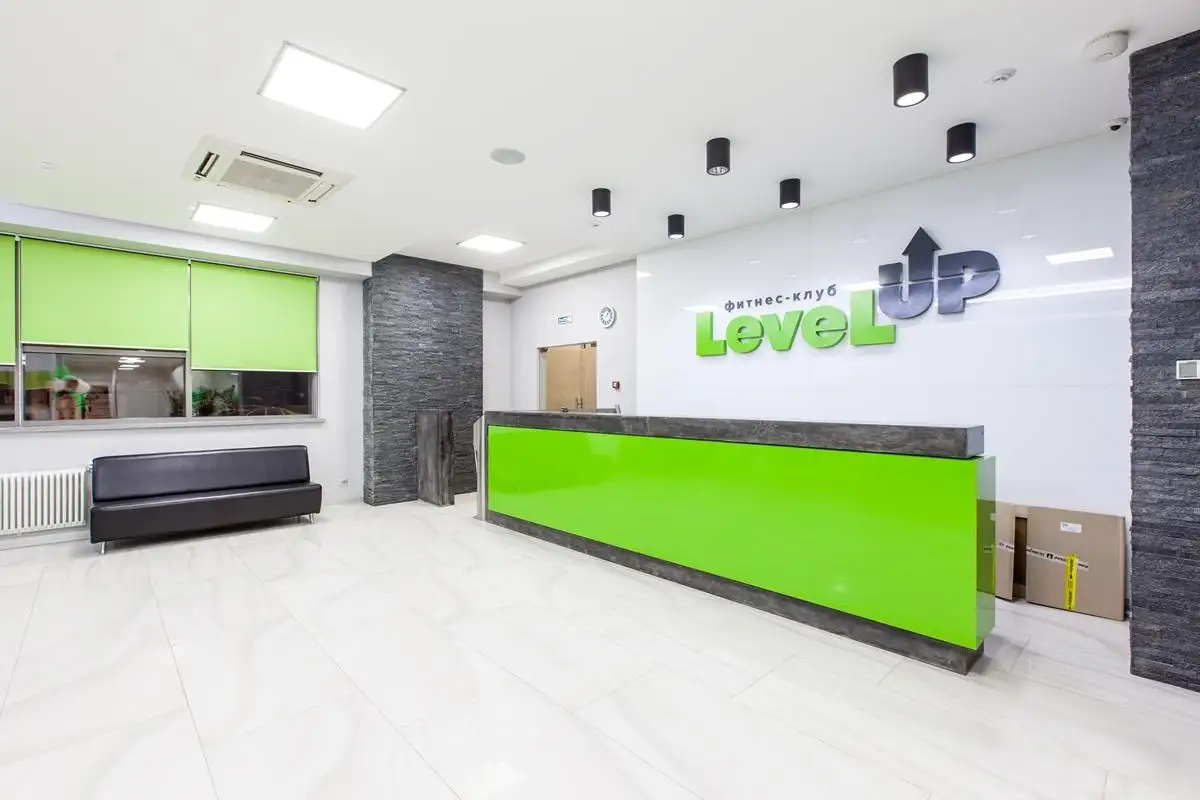 Level Up — это крупнейший фитнес-клуб Красноярска с бассейном. Зона ресепшн представлена удобными и красивыми диванами. Они очень гармонично расположились, не загромождая пространство холла. Цвета для диванов: черно — зеленый и бело-черный подбирали исходя из всей специфики заведения.