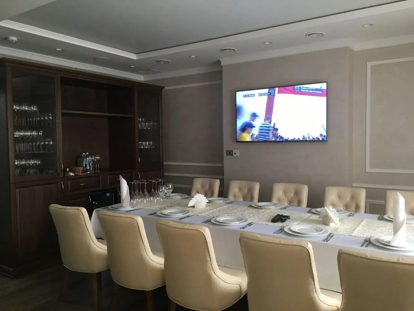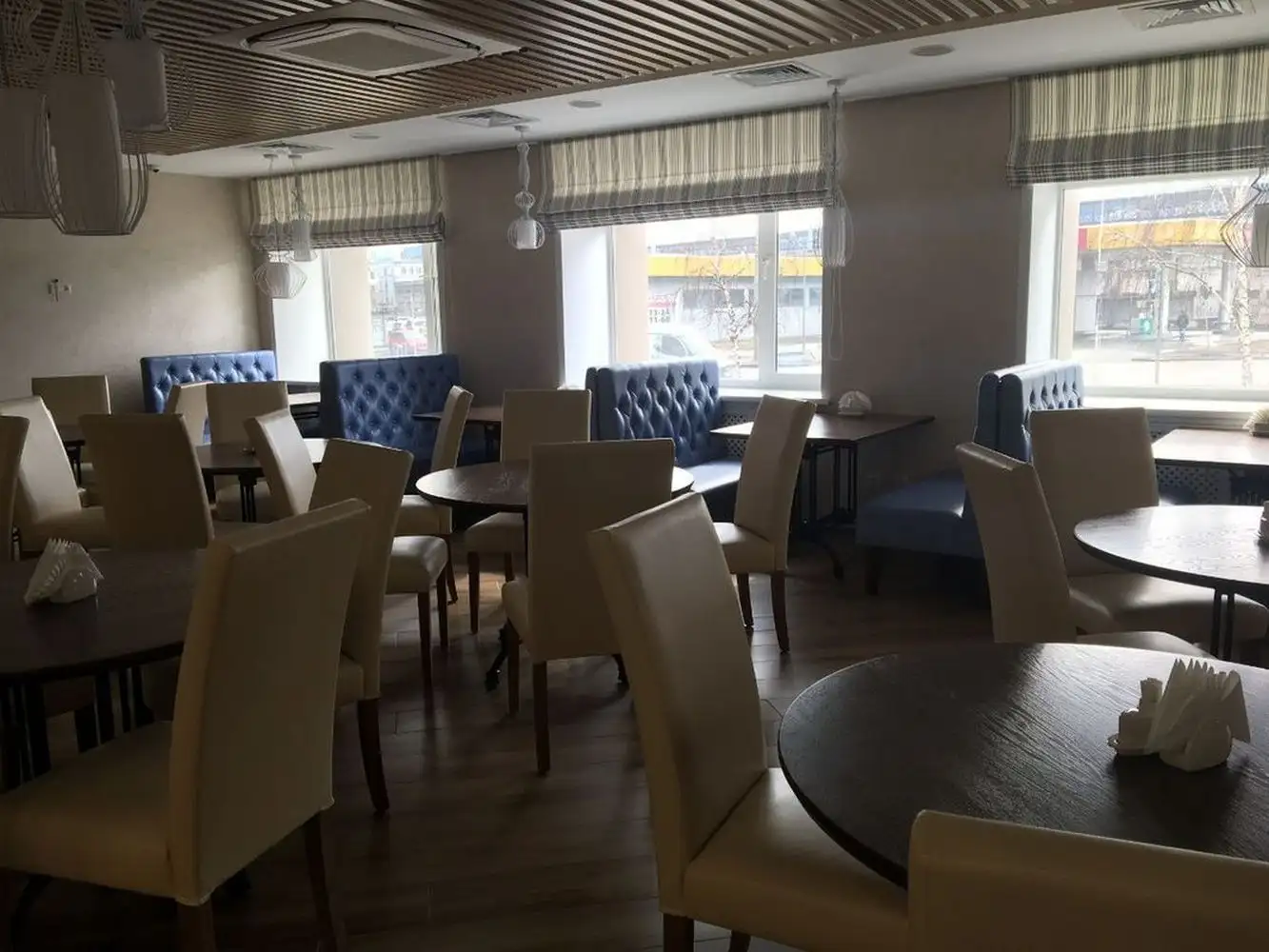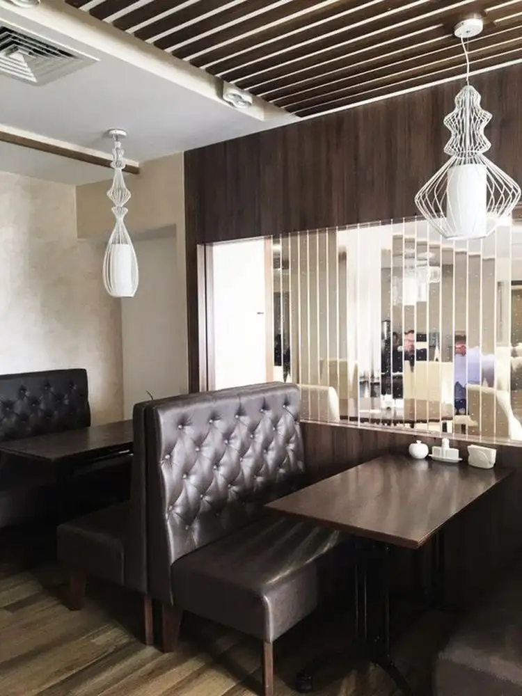Ресторан представлен диванами серии Олфорд коричневого цвета. Вип-комната ресторана представлена стульями бежевого цвета. На спинках стульев сделана каретная стяжка для поддержания одного стиля с диванами. Для столовой выбраны диваны тойже серии, но только синего цвета. Диваны Олфорд идеально подходят для ресторанов, кафе, столовых. Их эргономика позволяет сидеть на диване удобно, комфортно, не чувствуя напряжения в теле.