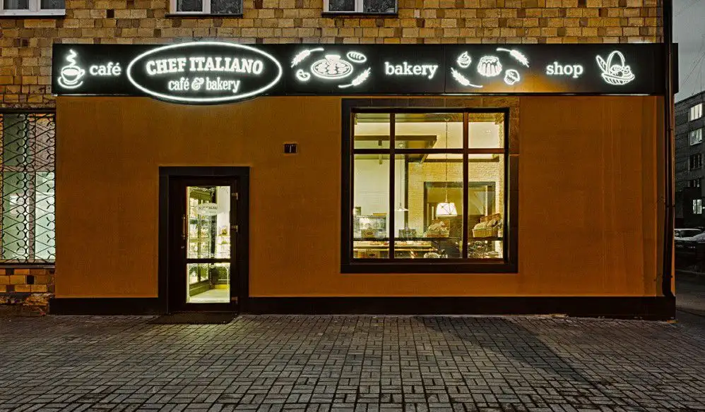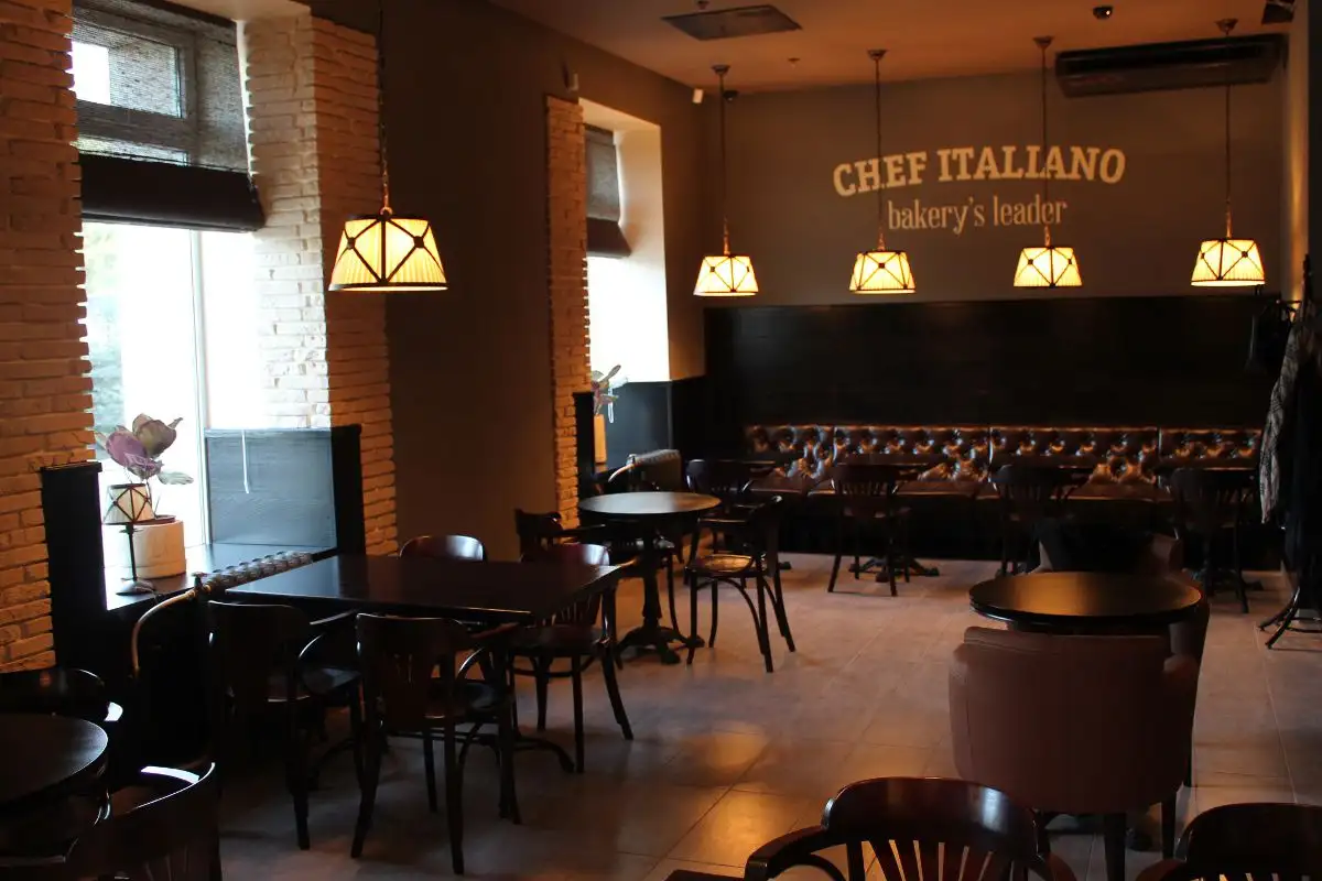 Кафе"Шеф Италия" — небольшой островок маленькой Европы в Красноярске. Уютная атмосфера располагает к приятному времяпрепровождению. Интерьер выполнен в стиле пекарен Италии 30-х годов ХХ века. Все элементы декора были привезены из Италии. В Красноярске изготавливали барную стойку, мягкую мебель и потолки.
