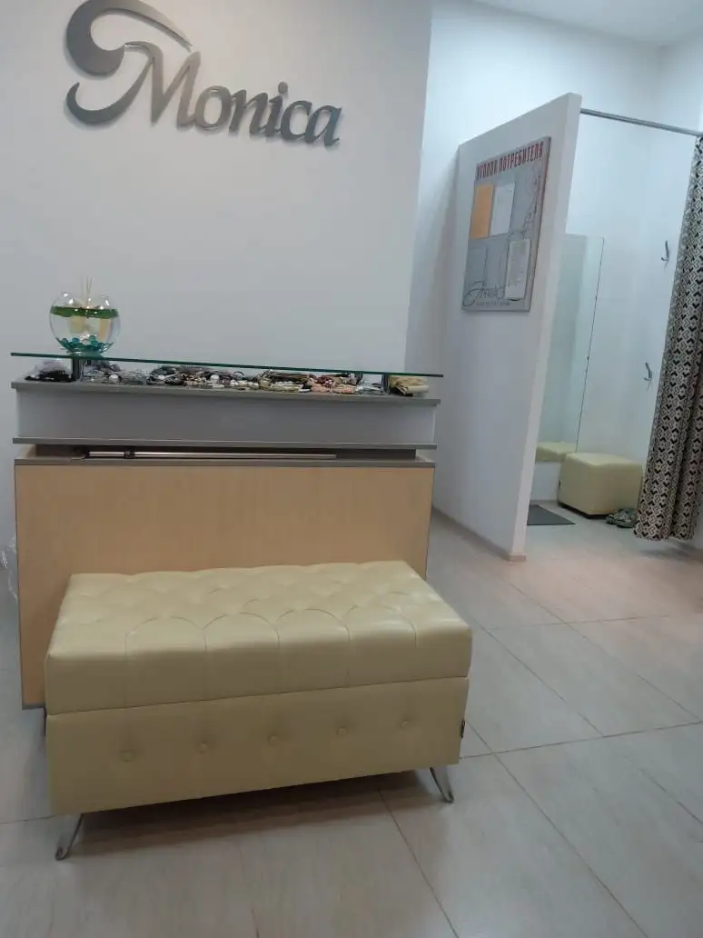 Стойку администратора дополнили пуфом Консул. Металлические опоры придали ему легкость и воздушность.