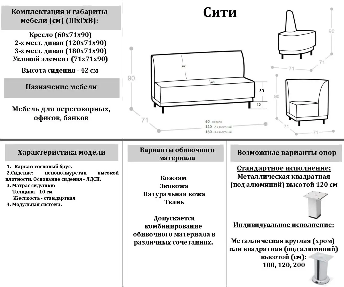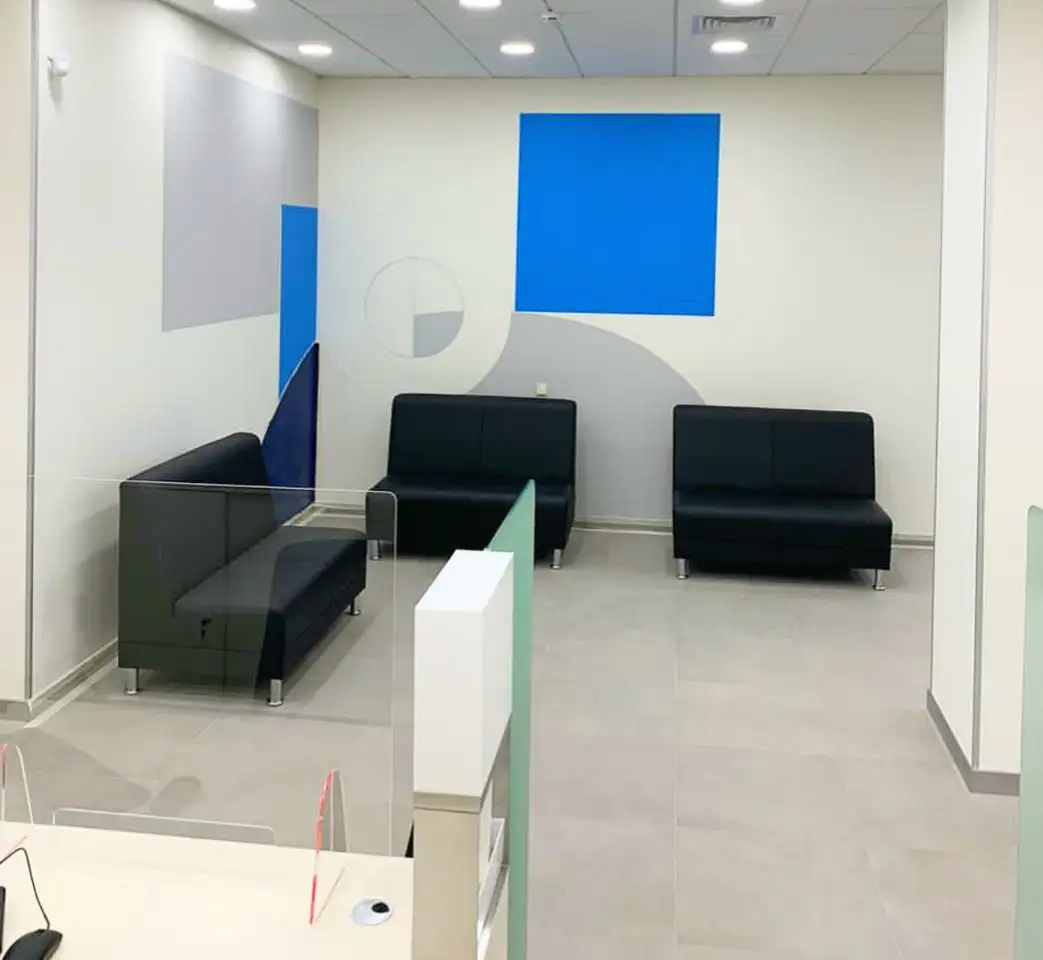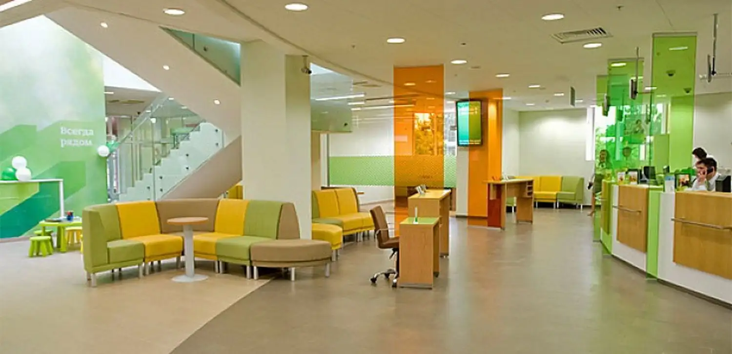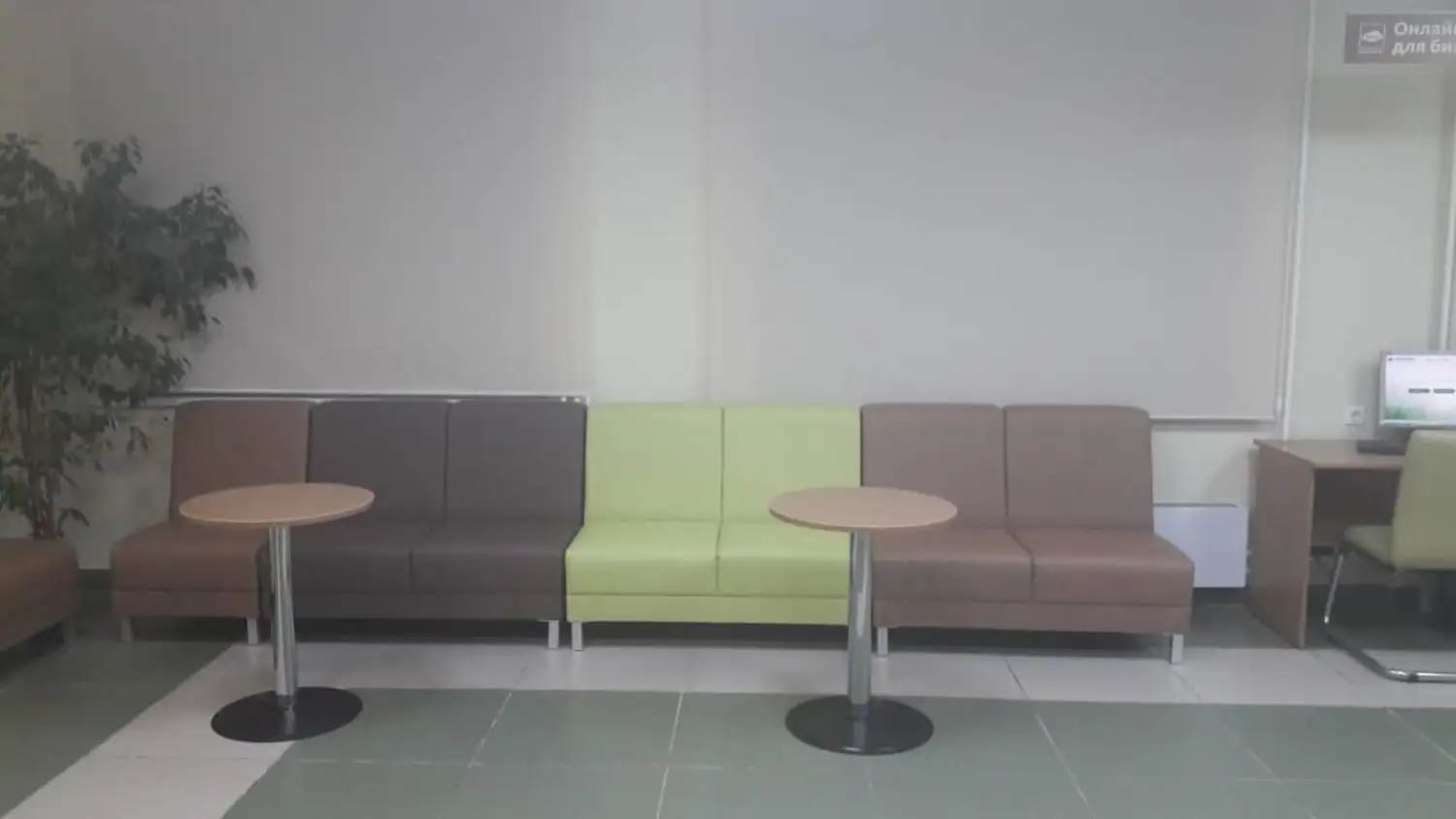 Мягкая мебель в Сбербанке представлена диванами Сити. Это модульная система, которая позволяет выставить диваны не только по прямой линии, но и в виде острова. Цвет был подобран так, чтобы подходил под основной цвет сбербанка.